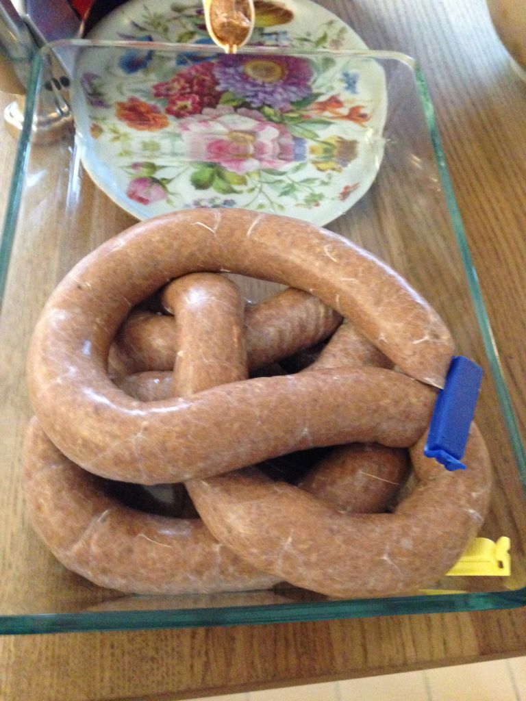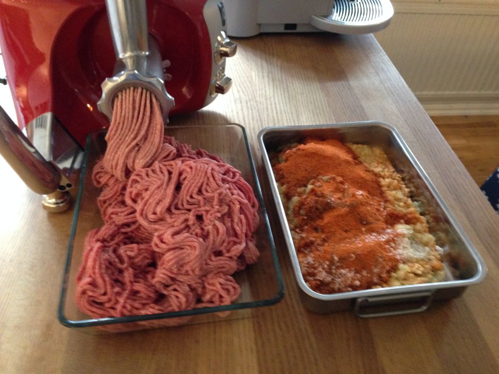 Sista för idag. Skall in till stan och försöka få tag på mindre (smalare) och tunnare fjälster. Från inköp till färdig korv, ca 3 timmar. En stackars meter korv i timmen. Puh! De här tjockisarna kan man inte knyta och glänsa med heller, man får snurra på rad.