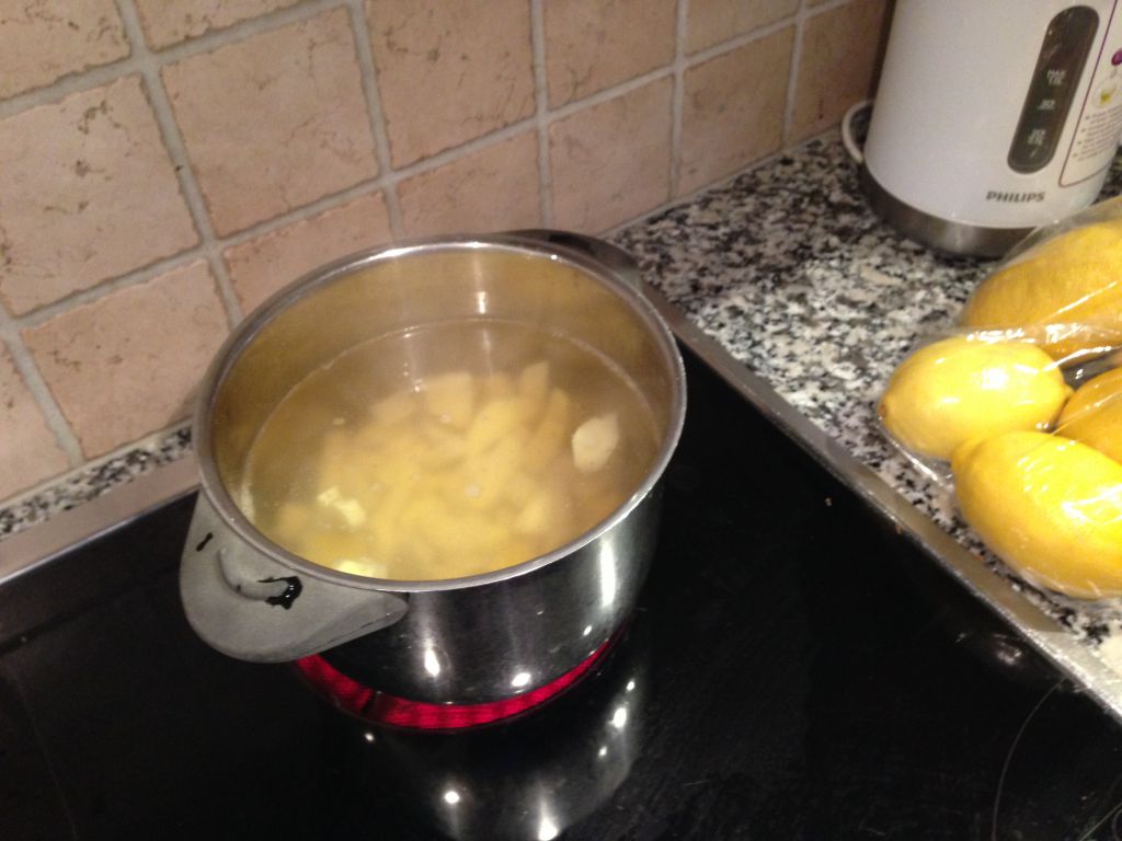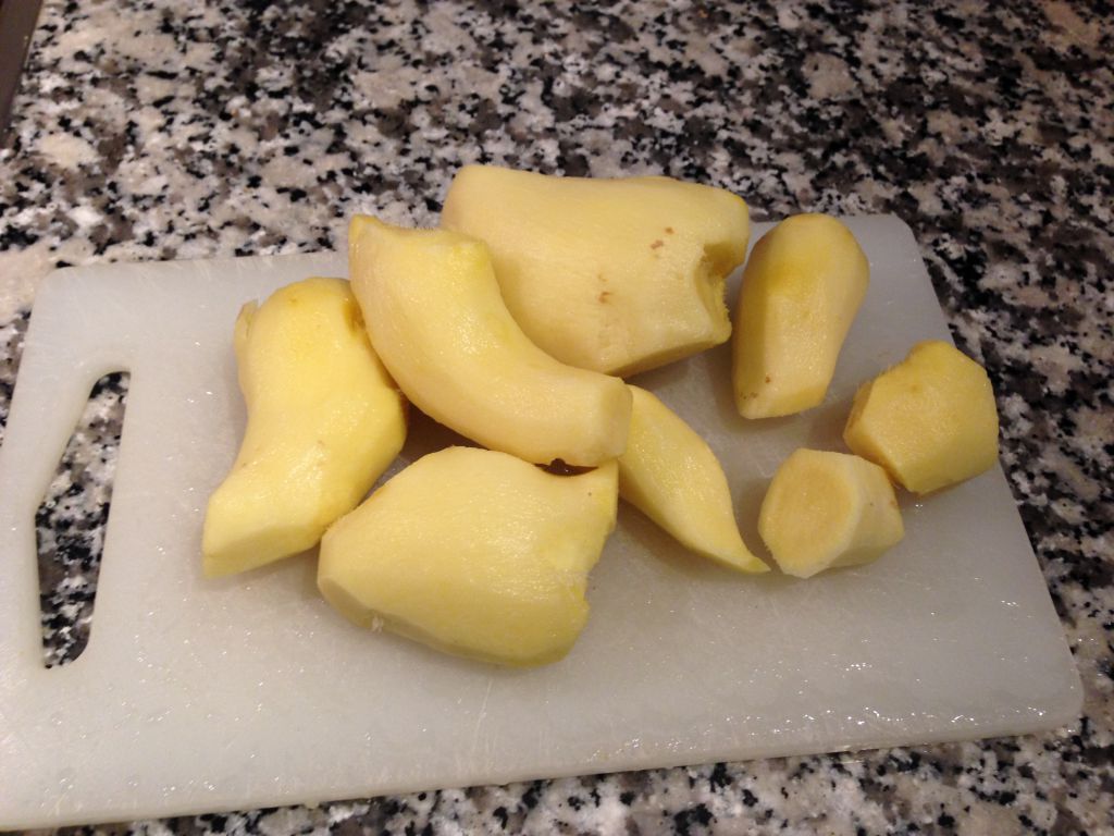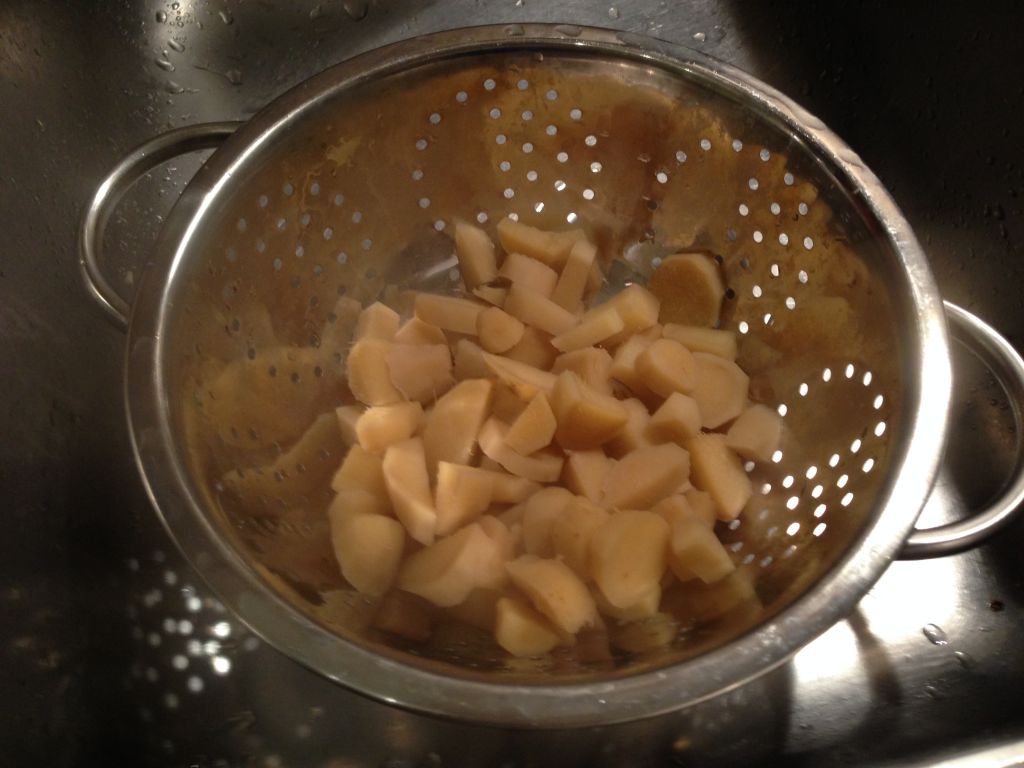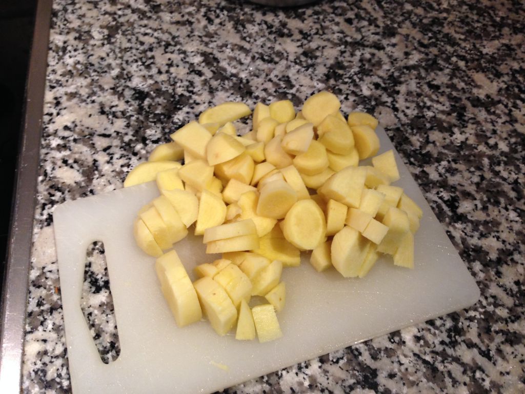 Knölarna skivade till skivor och mindre bitar för att reducera koktiden.