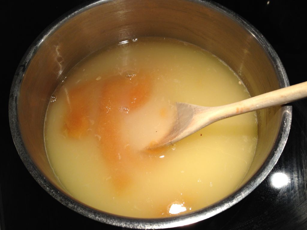 Tillred lagen i separat kastrull mot slutet av koktiden, den skall koka upp i ca 8 minuter. 5 dl socker, och 2.5 dl vätska (typ vatten). 1 pressad citron och apelsin blir knappt 2 dl. Fyll på med vatten till 2.5 dl. Tillsätt 3 stora matskedar honung, i min inläggning nästan ren ljunghonung. Jag råkar känna en myc…