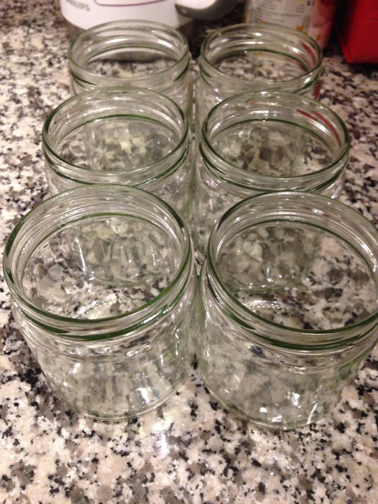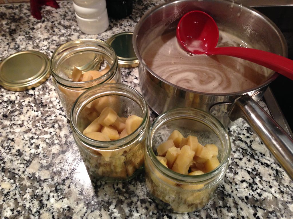 Väl rengjorda och urdiskade 500g honungsburkar duger gott till ingefäran.