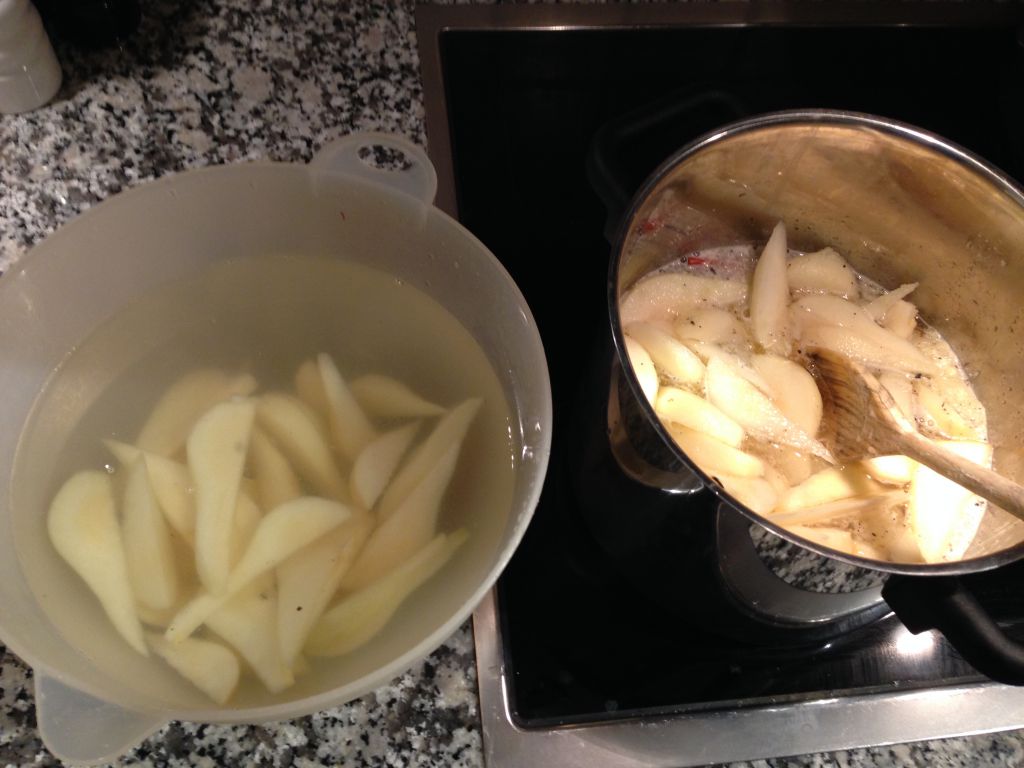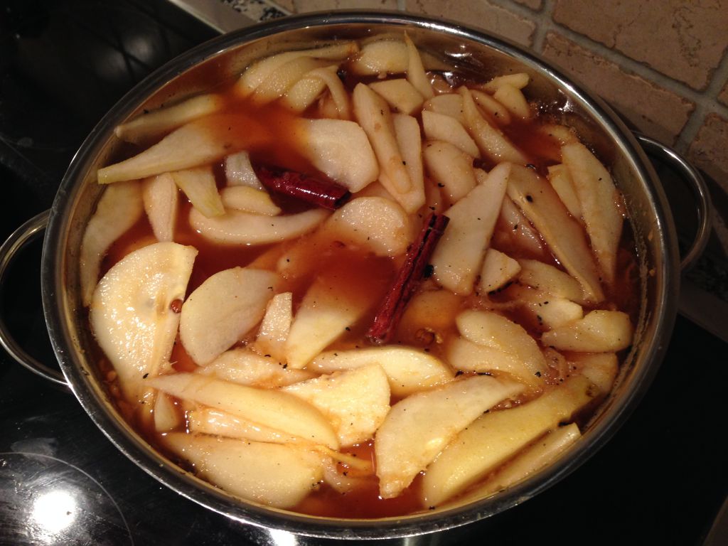 Jag klyftar päronet i 6 delar för att reducera koktiden och få smakrikare päron. När lagen med 6 dl vatten och 8 dl socker kokat upp åker allt ner försiktig under omrörning.