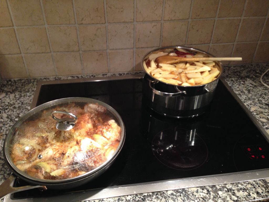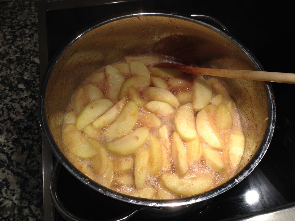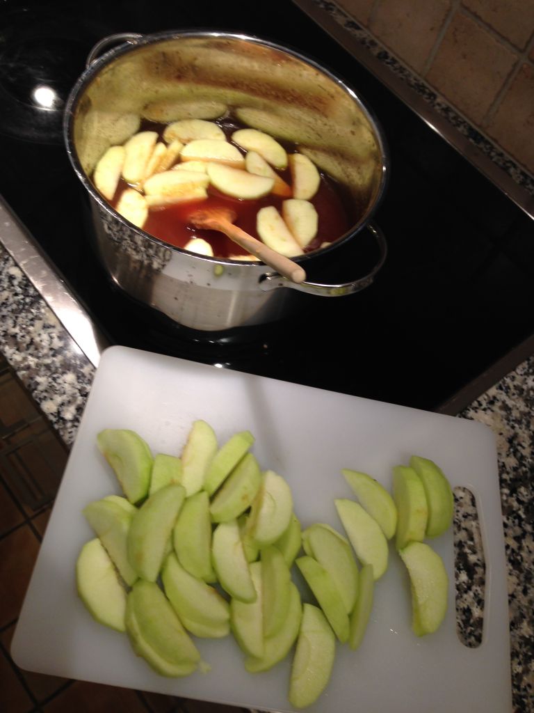 När dagens inkokta päron blev klart (4 burkar) så fanns det lag kvar till mera. Man kan ju inte bara hälla ut en lag med Ingefära, vaniljstång, Kanelstänger etc. Det som skulle kunna passa var 5 sura äpplen jag hade hemma.