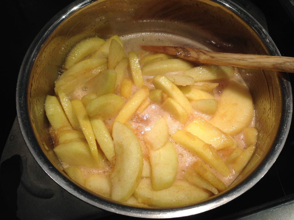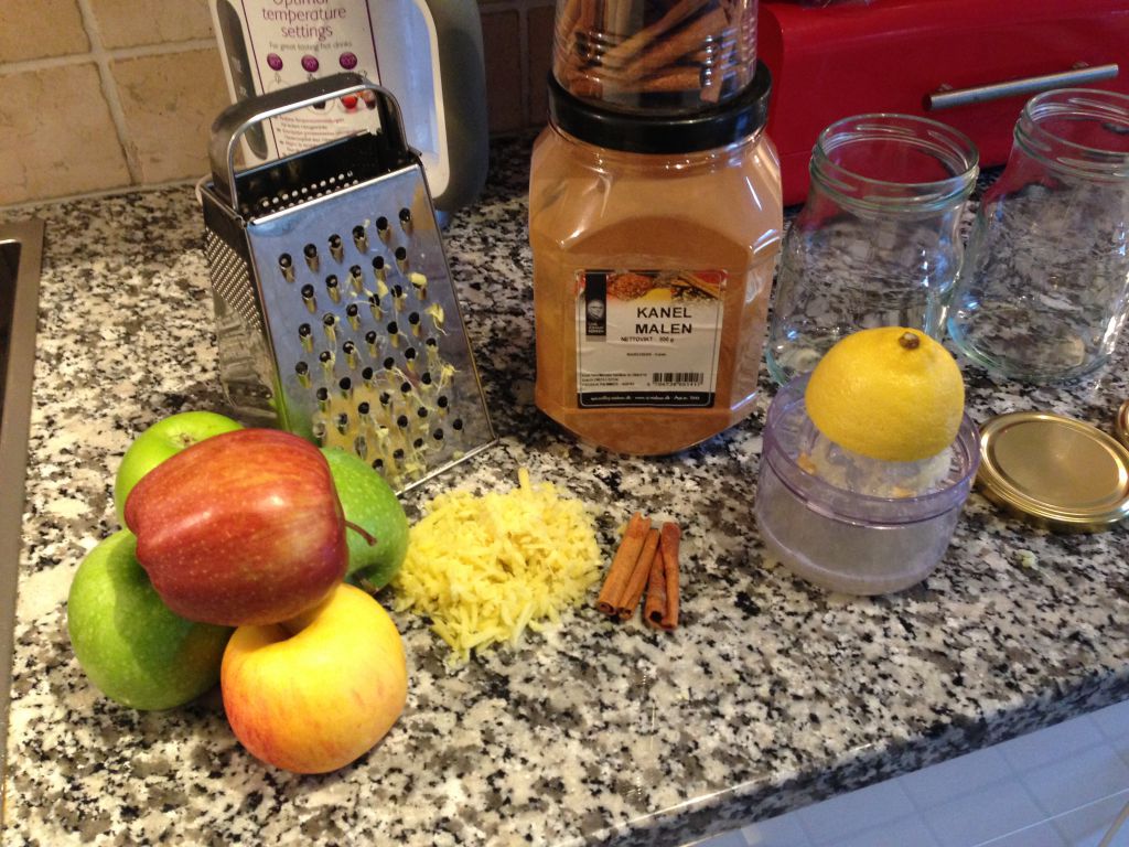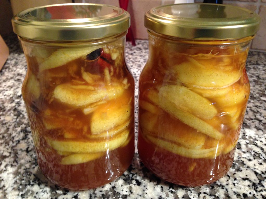 Dags för äpplen inkokta i ingefära och kanel. Tre syrliga och två lite sötare äpplen. Lagen består av citronsaft, 4 st kanelstänger, 4 dl socker, 5 dl vatten och lite grövre riven ingefära. När lagen kokat upp tillsätta 1 slät tsk kanelpulver.