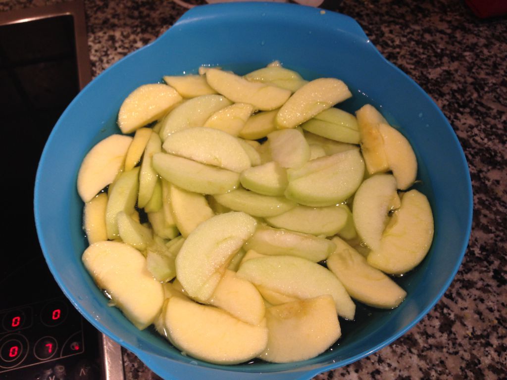 Äpplena klyftas. Så länge äpplen och klyftor ligger i kallt vatten går oxideringen långsammare (mindre bruna)