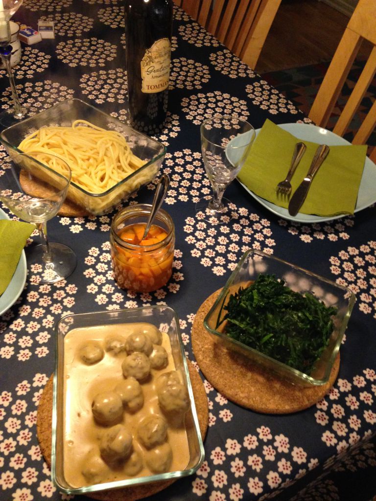 Gräddiga egna köttbullar med fryst spenat från i somras och färsk rörpasta kört i hushållsassistenten. Fredag, ett glas vin och man mår som en prins. Mitt på bordet står dagens pumpa som inte kom längre.