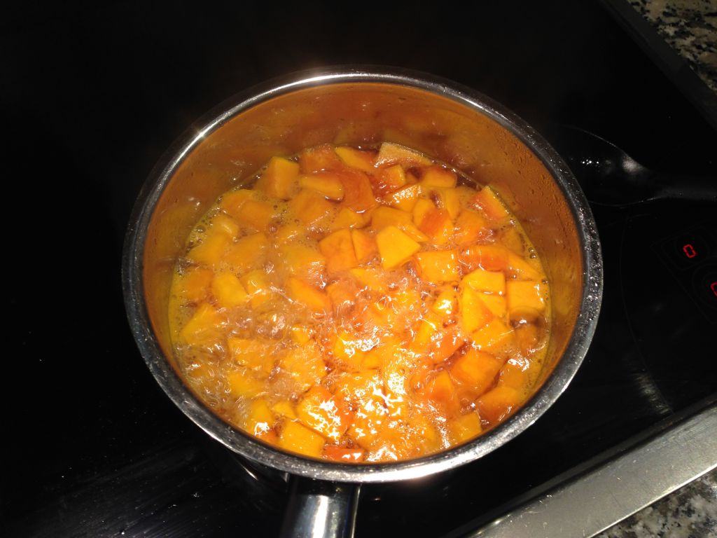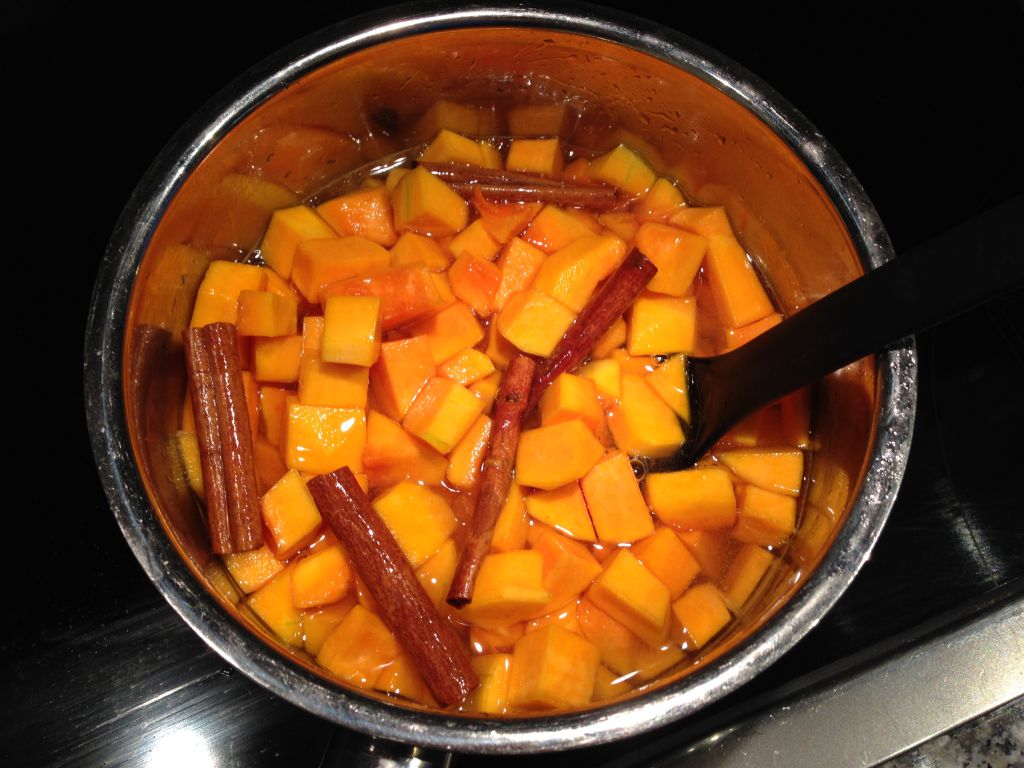 Häll socker, ättika, vatten, kanelstänger samt pumpa tärningar i en kastrull.