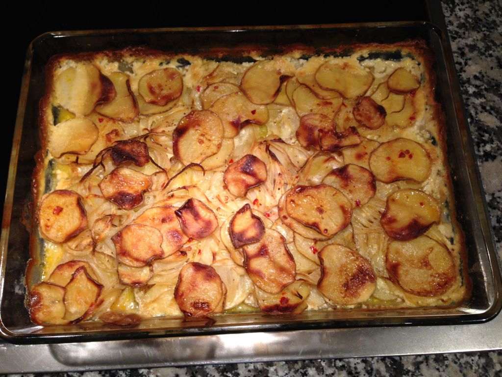 Använder mandolinen, 5-6 potatisar, 5-6 större schalotten- lökar. Salt, peppar, chili i lagom mängd. 25g smör, 2 dl vispgrädde, 2 dl mjölk. Grädda i 200 grader tills den får fin färg.