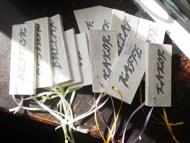 Skyltar med olika texter på som: KAFFE, TE, KAKOR; BULLAR och BESTICK.