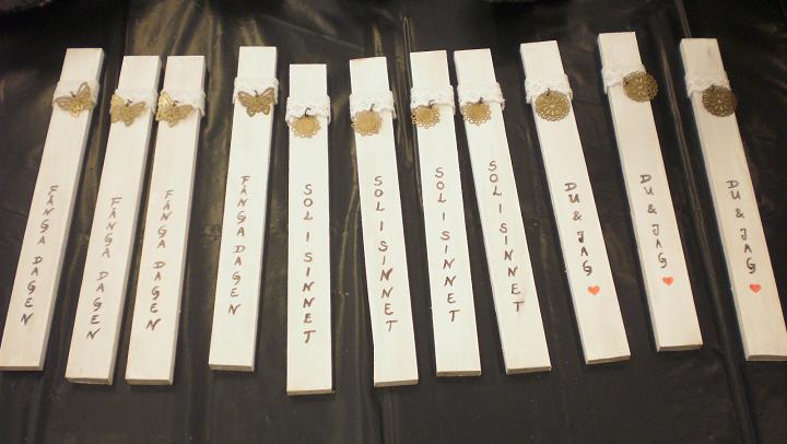 Tankepinnar med lite olika texter på. FÅNGA DAGEN, SOL I SINNET och DU & JAG med ett hjärta.