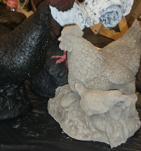 En höna i samma storlek som den svart till vänster, men med ägg och 2 st. kycklingar, så därför tyngre och så. Tuppen jag håller på med också i bakgrunden.