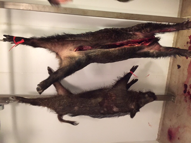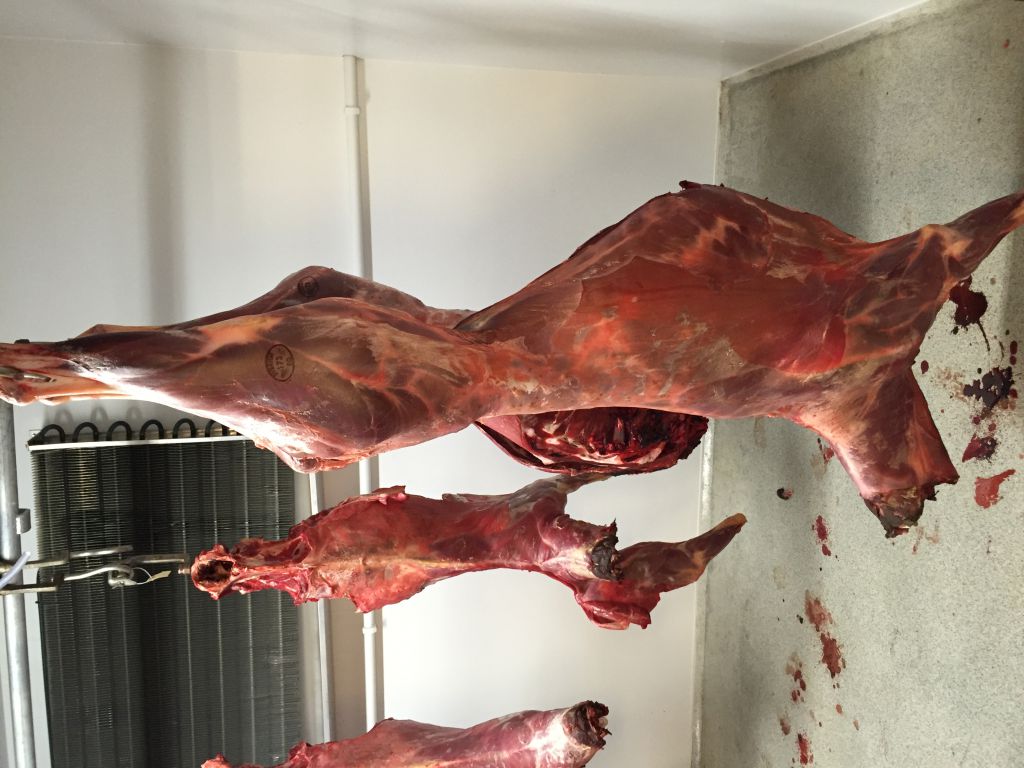 Färdighängda kronvilt som blivit besiktigat, klart för styckning.