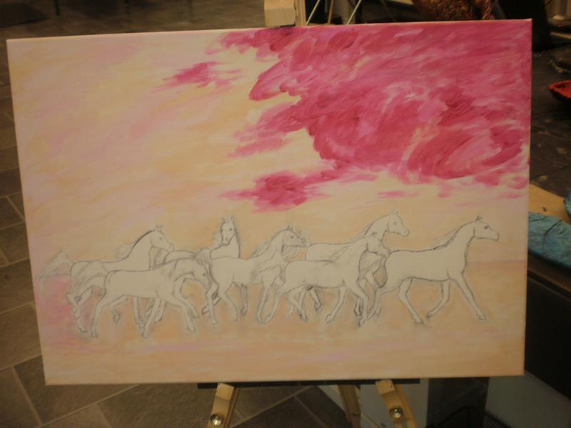 Jag har drömt om 7 st. Arabiska Fullblodshästar & började idag att skissa & sedan måla upp lite på tavlan. 25/6.