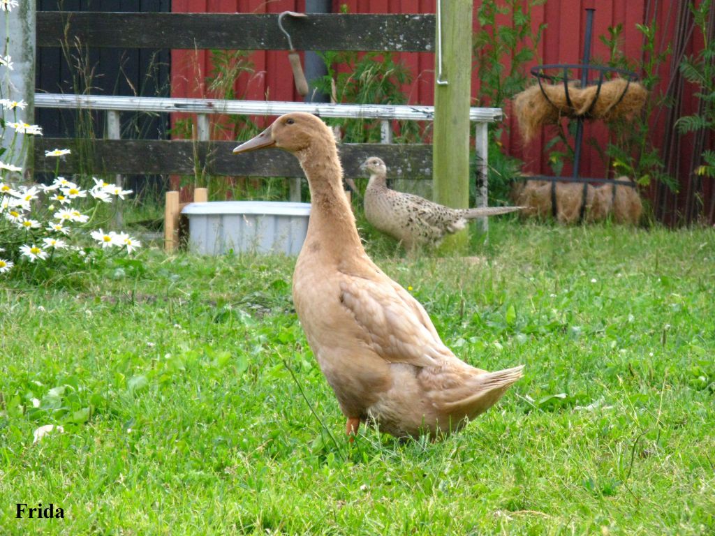 En av fasanhönorna som bor här kommer för att proviantera  Kakan min lilla Khaki Campell flicka
