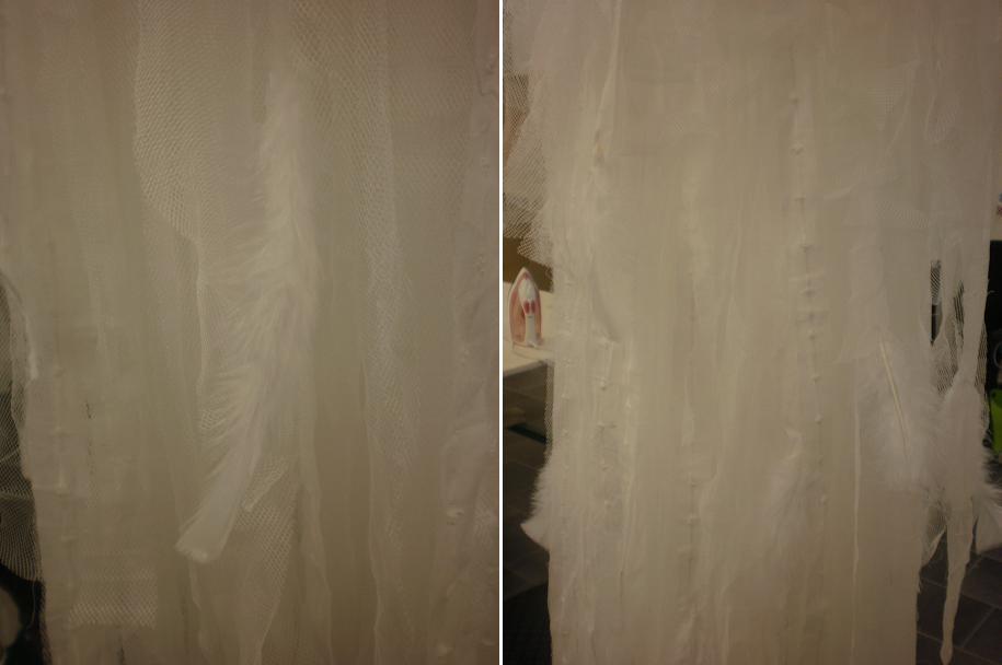 Här kan ni se detaljer från vindmobilen min med 2 st. olika tyger & vita fjädrar.
