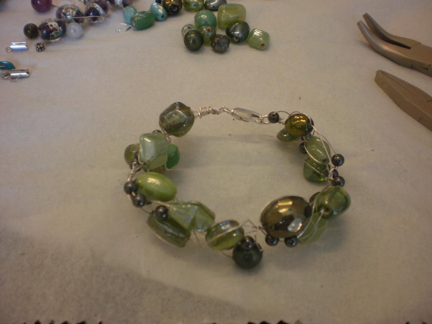 Ett armband i silvertråd & med en massa olika gröna toner av pärlor & stenar.