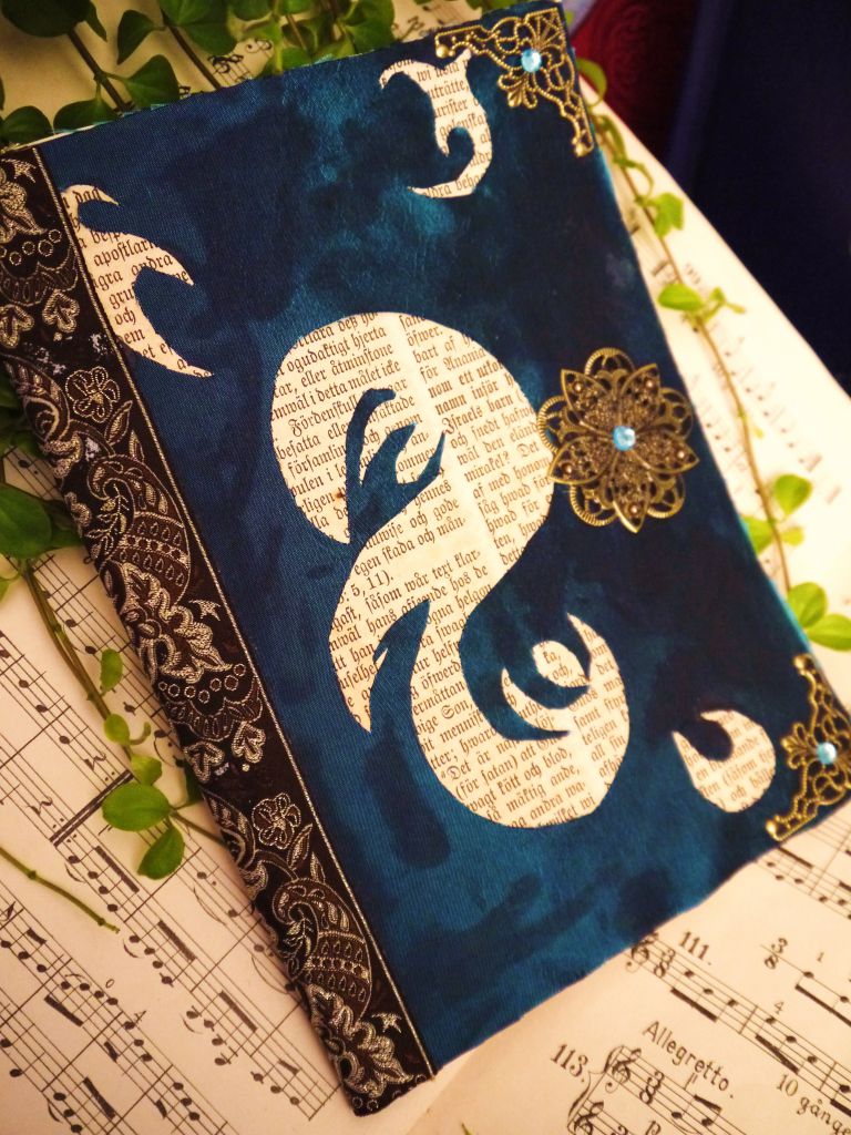 Har precis gjort färdigt en hemmagjord, egenbunden anteckningsbok på 50 sidor.. Den är gjord av kartong, papper (såklart..) taft, dekorationsband och diverse metalldekorationer.. Jag hade tänkt lära mig göra såna här som jag ska sälja tillsammans med fjäderpennorna jag också tillverkar, och även om den här som är min allra första blev lite småhattig i kanterna så är jag ändå väldigt nöjd för att vara den första..