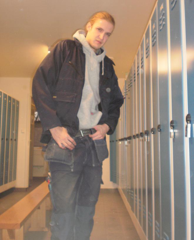 Ja, jag i arbetskläder igen. Uppsatt hår i en tofs i nacken.