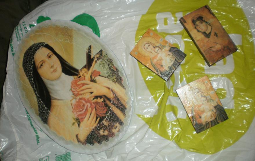 Brädorna är först betsade i brunt visa & en i grått, bilden har klistrats på & sedan lackats med en vanlig lack & efter det med en spraylack för att få dom att se gamla ut.