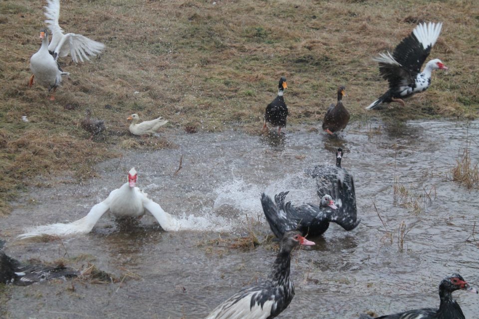 Hahaha! Det ser ut som ankan i vattnet skriker "Flytta på er annars skvätter jag tills ni går" Helt fantastisk bild =)