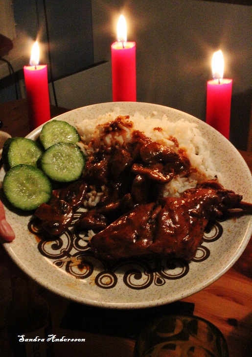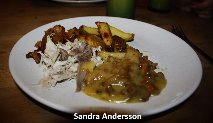Tuppen på tallriken ihop med klyftpotatis i ugn, lite av de gula kantarellerna tuppen låg o badade i när den tillagades och kantarellsås. Letade efter grönsaker med, hade blivit fint... Men tyvärr var de slut. Det enda jag hittade var en skrumpen paprika.