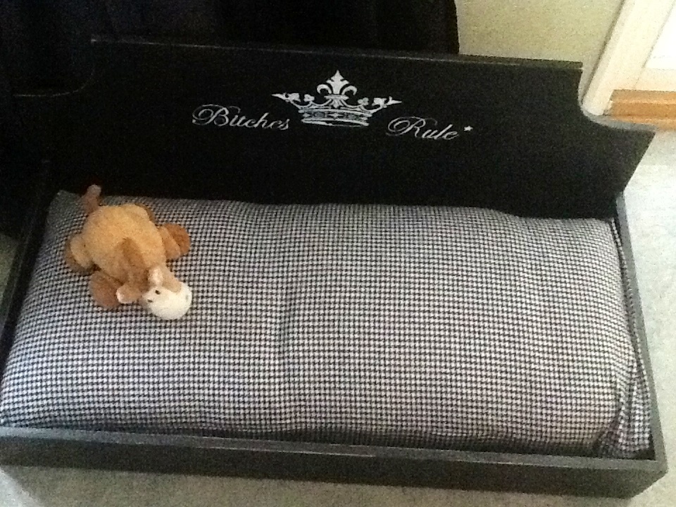 Här är hundbädden med en kudde som jag sytt med.
