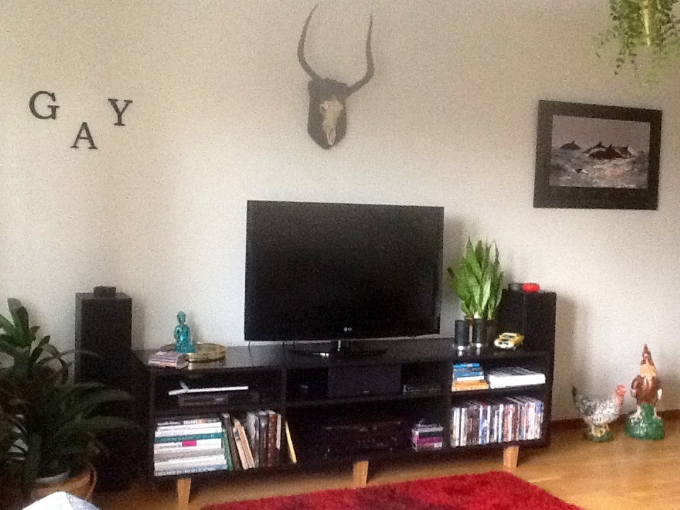 Den är byggd i 2 cm mdf skivor och med baksida av en tunn mdf och bena av alm. Bena är stuvbitar jag hade från en almskiva som man brukar lägga på köksbänkar. Limmade ihop stuvbitar så dom vart extra tjocka. Limmad och skruvad ihop hela bänken flrrutom baksidan som är skjuten fast med en liten spikpistol. Grundmålad och sedan målad med svart inomhusfärg. Materialet i allt i allo gick på 500 kr. En sån här stor tv-bänk hade nog kostat ca 4-5000 kr eller mer om man köpt den i handeln.