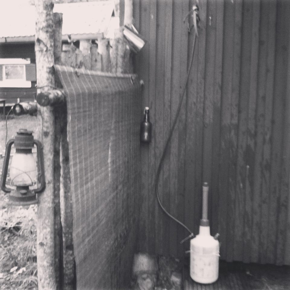 Riktig utedusch var rätt trevligt, hade trätrall och presenningsväggar, hink med vatten och skopa. Fungerade tills höststormarna tog presenningen. Blev ganska kallt också mot oktober-november till, eller när det blåste. Ingen njutning då.