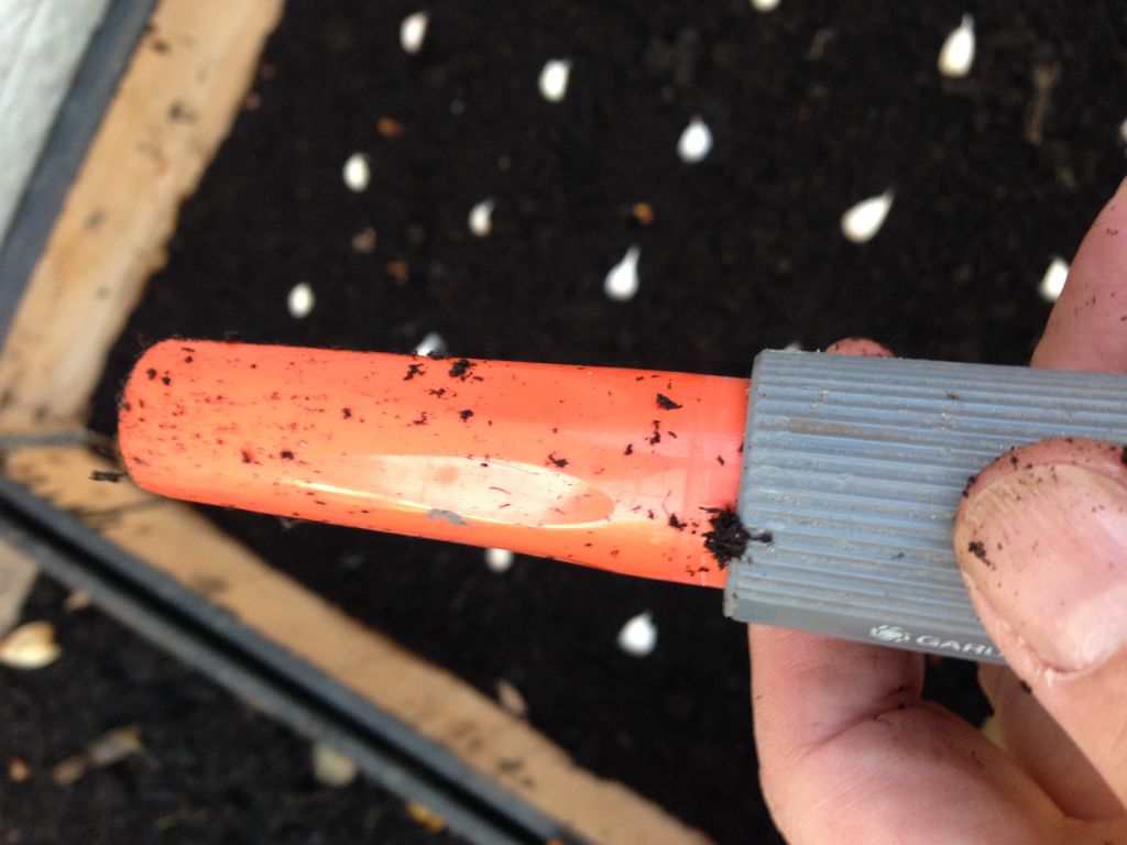 Min planteringspinne (en Gardena pryl) där det röda sticks i gjorden. Lagom stort och lagom djupt.