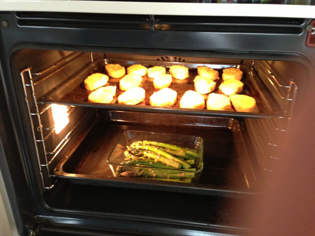 Smält riktigt smör och massor av pressad vitlök. Pensla skivorna på en sida med mycket av det goda. Värm överst i ugnen med grillen på.