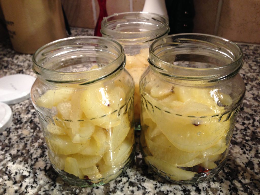 Fördela päronhalvorne med 1-2-3 metoden till lika antal i burkarna.