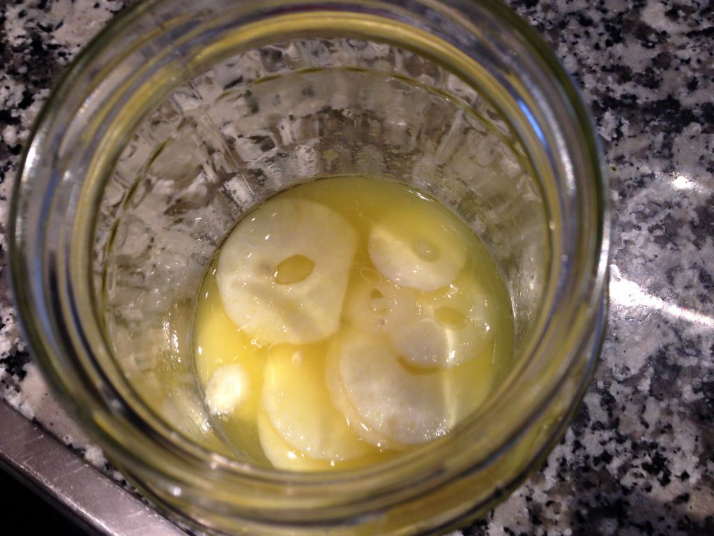 Häll citron och apelsinsaft i burken. Skiva vitlök och lägg i.