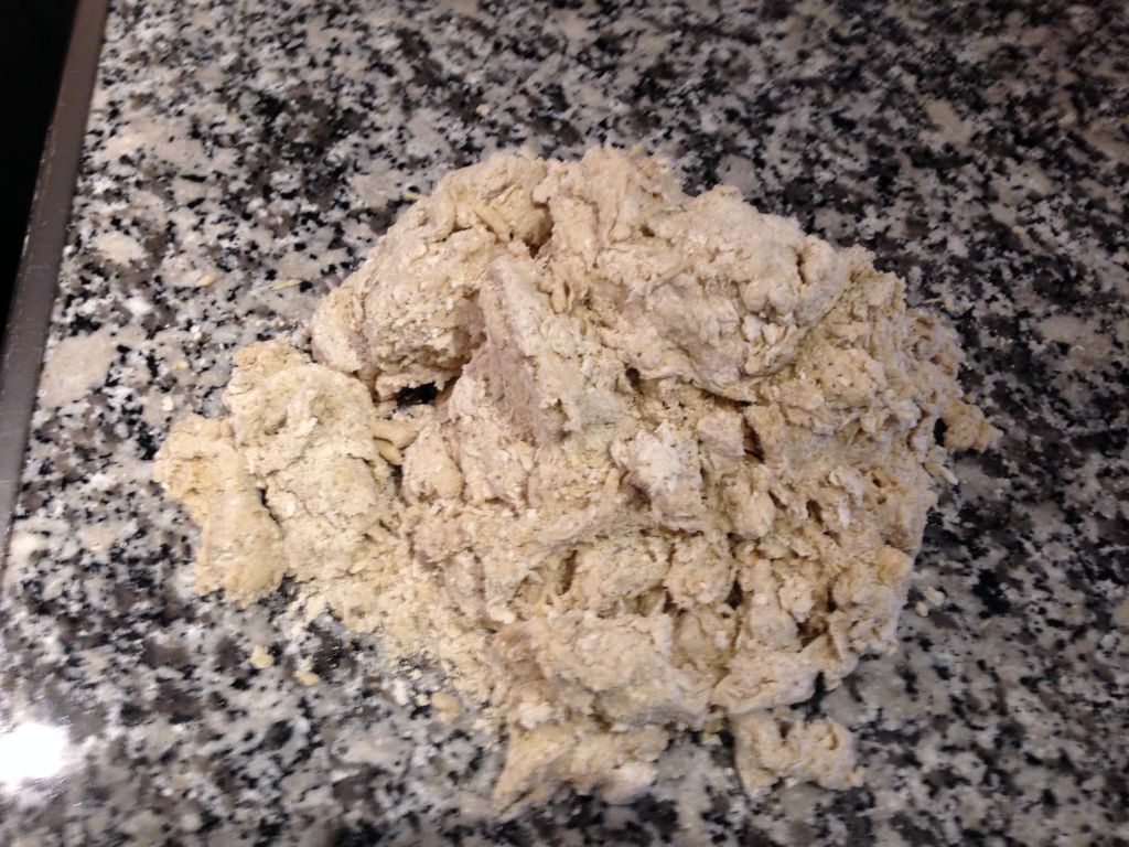 Häll ut blandningen och knåda ut degen för hand. Den skall vara torr och lite klibbig.