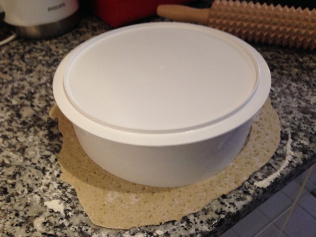 Använd fantasin, jag tog jäslocket till hushållsassistentens kärl. Tryck ut ett runt bröd.