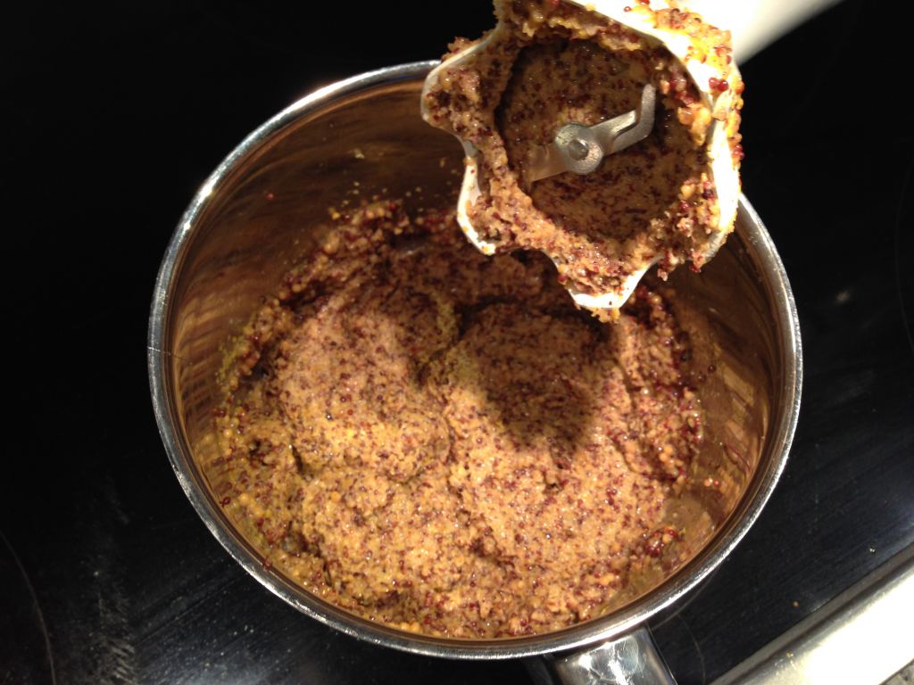 Tillsätt i stor klick honung (1 msk) och mixa ner halvan till en fin smet. Man kommer inte åt allt med mixern, det är bara att peta in mot mitten av kastrullen med en slev och köra lite till. Rustik senap behöver inte vara perfekt.
