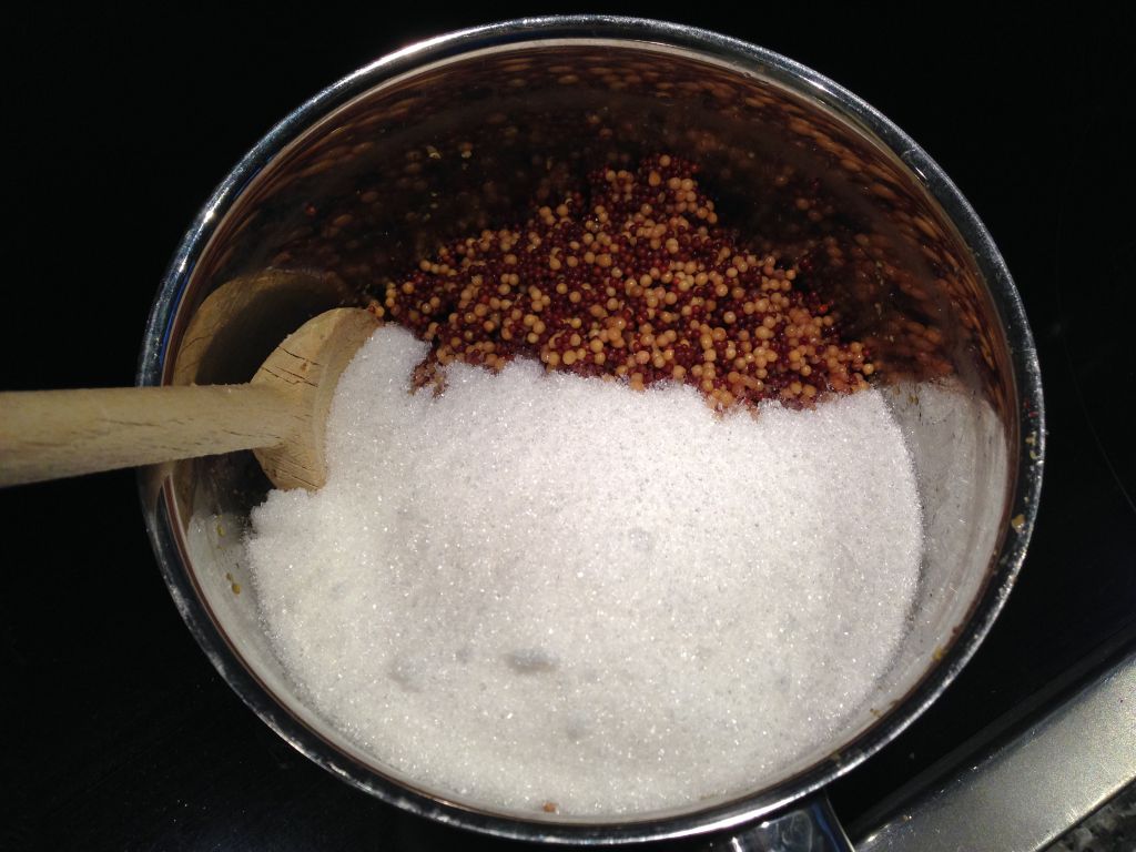 Tillsätt den andra fröhalvan och sockret. Rör om i grytan och fördela sockret.