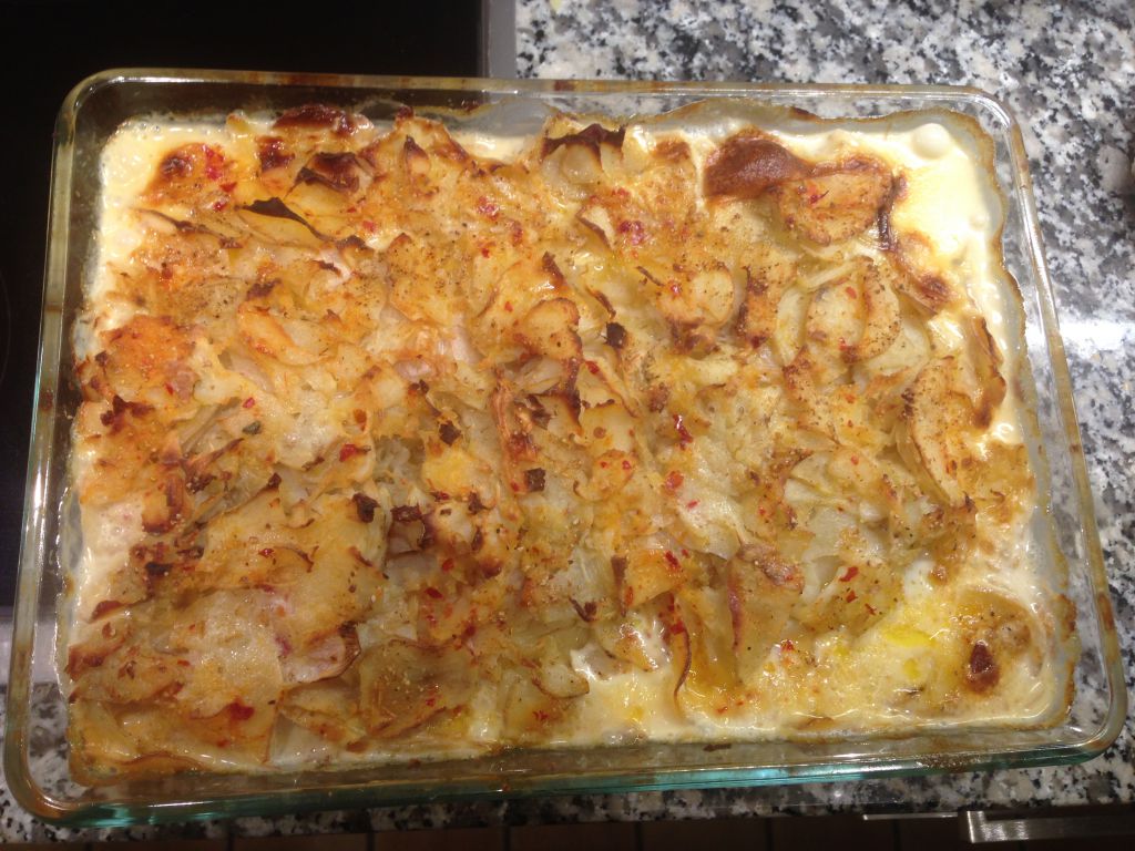 4 potatisar, 4 lökar, 4 schalottenlökar, 4 potatisar (till), 4 dl vispgrädde, 4 klickar smör, salt och peppar.