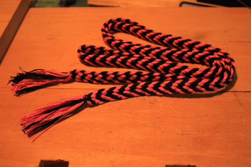 En bild på ett kumihimoband under flätning. Ställningen kallas Marudai, just detta exemplar är som synes gjord av mig av ett kakfat med hål i och gardinstång som ben   . Spolarna som tråden är i kallas traditionellt "tama". Googla på det så får ni se mycket roligt!