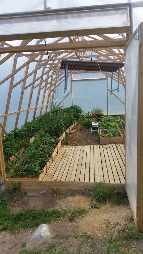 Full fart och i bakgrunden syns inblåsningen. Två lågtrycksfläktar från biltema i var sin ände på växthuset med sammanlagd effekt av ca. 35W