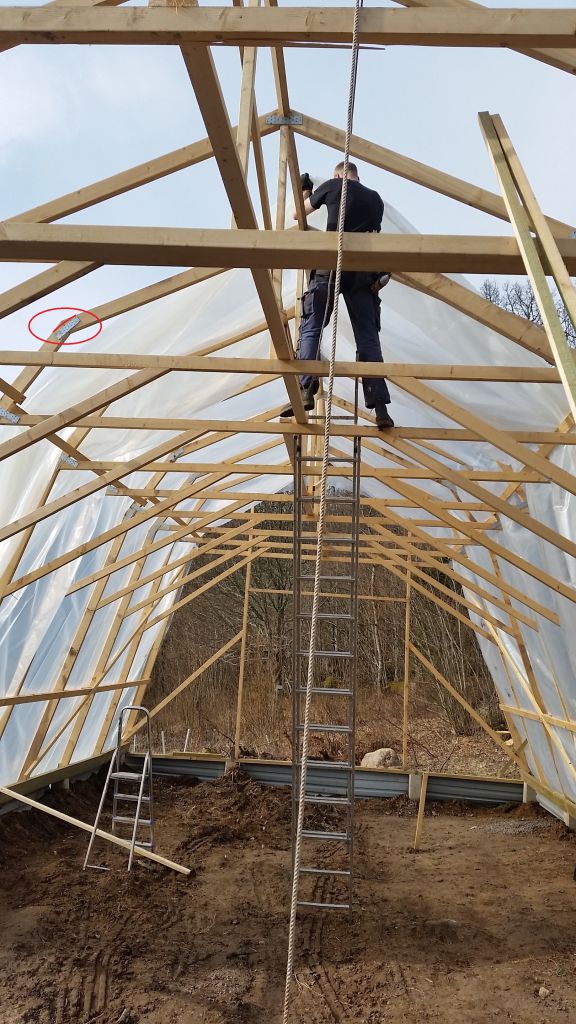 På bilden syns en av punkterna jag skulle förbättra i nästa växthus om jag byggde samma modell. Runda av hörnen på bågarna om man lägger dubbel plast annars bildas det köldbryggor där.