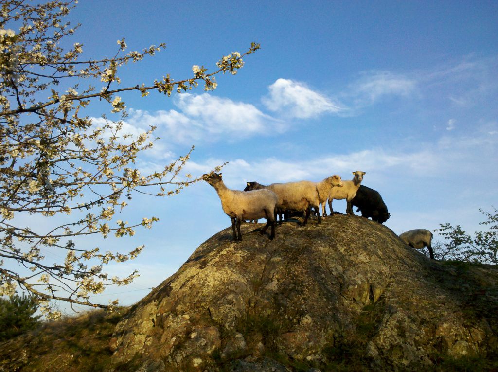 Mina får har ett berg i hagen som de älskar att klättra på. När de är där uppe har de full koll. Man kan till och med stå där och knuffas lite.... Ännu har jag inte sett någon ramla i alla fall.
