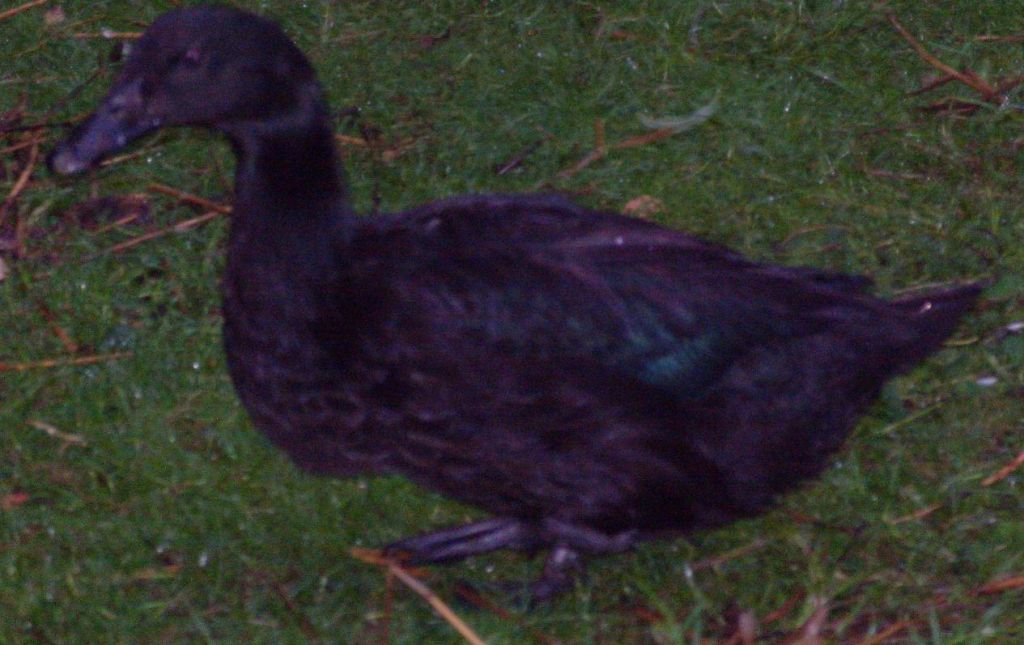 En tyvärr lite mörk bild av min cayugaanka. Osäker på könet. Vill gärna få tag på fler cayugor, eller avelsägg till våren. Jag köpte 6 avelsägg för några månader sedan, bara denna kläcktes...