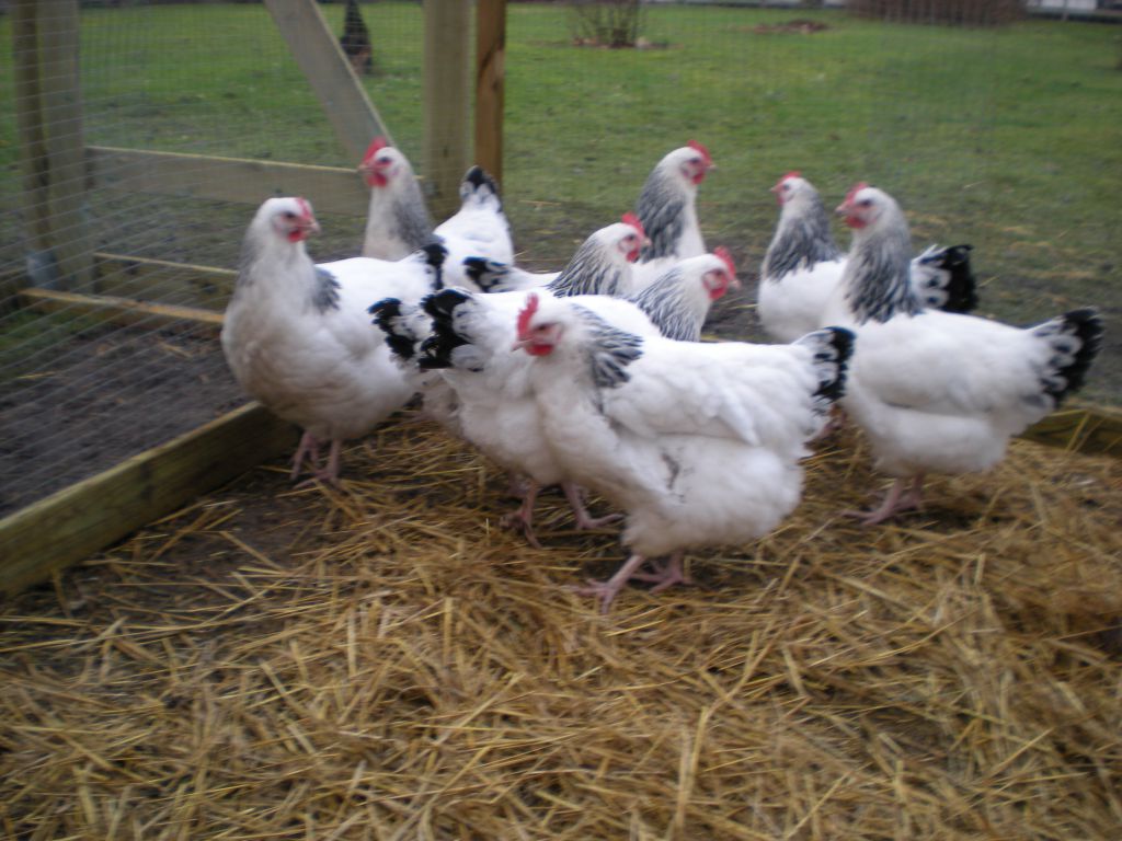 Två silverhalsade Leghorn, två vita Australorp, en svart Australorp, en grå Islandshöna och en svart Aracuana samt den svarta Aracuanatuppen.