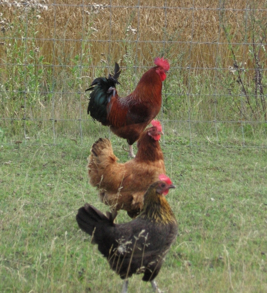 Jag gillar den här bilden eftersom de råkade stå så att det i den här vinkeln ser ut som om de balanserar på varandras ryggar! Uppifrån tuppen Stig-Sören (vi sportar med udda tuppnamn), Hulda och Marta. Vad gäller raser är de en salig blandning.