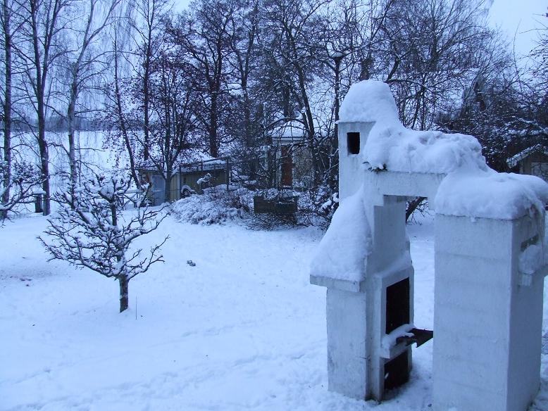 Vi bor i tätort och här kan du se delar av tomten med hönshuset, bykhuset och ån längst bort. I fronten kapellet vi nyttjar till grill året om.