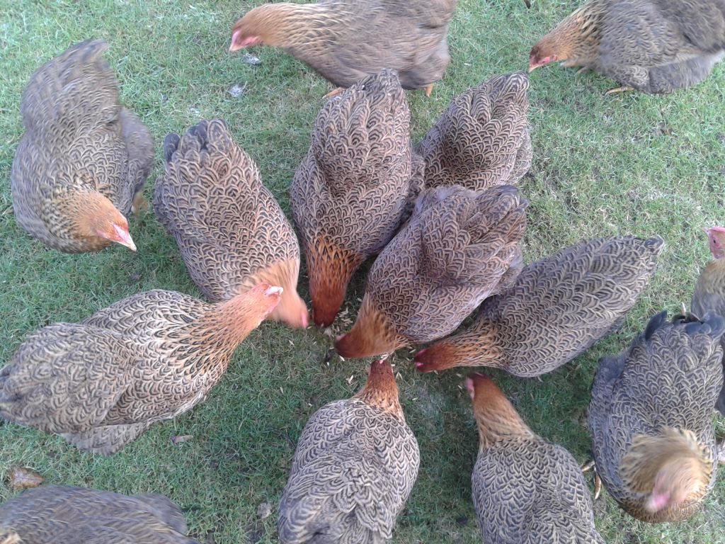 Dvärg Wyandotte hönor, guld svartbandade.