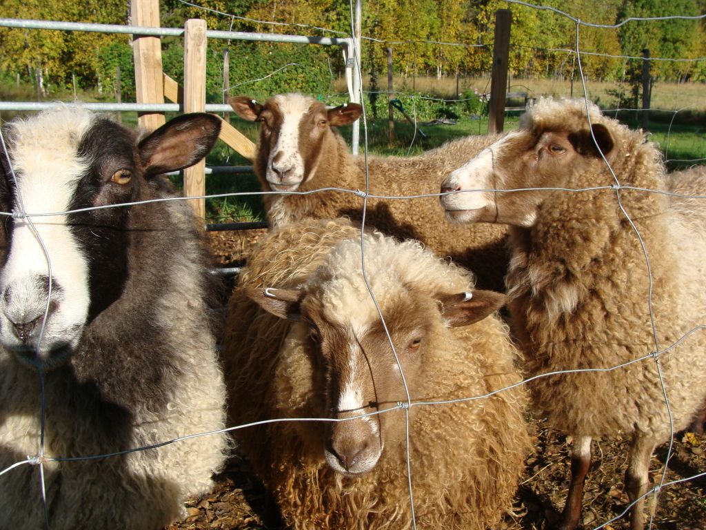 Bruna helsingefår samt den grå ursprungstackkan Saga.