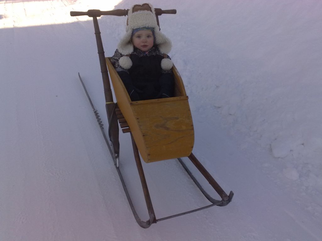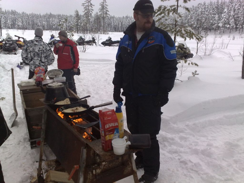 Gubben hugger veden med motorsåg och sedan skotar vi hem det med skoter och timmerdoning. Men i år sätter snön verkligen käppar i hjulet. Det är inte lätt att ta sig fram.
