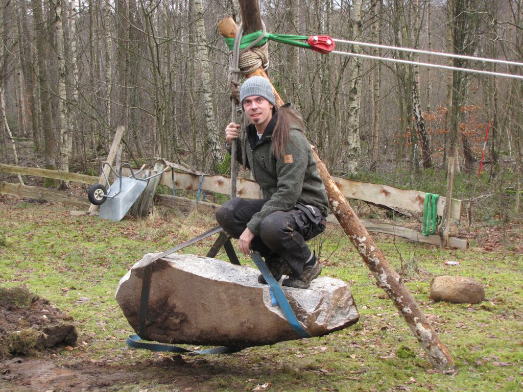 Jag har använt mig av en enkel handvinsch kopplad i ett träd. Vinschen har jag lagt dubbel så att den klarar dra ett ton, kopplat till ett rep som jag också lagt dubbelt och bundit i samma träd.