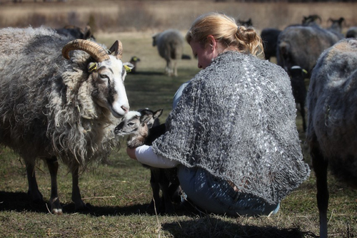 Stickad sjal av handspunnet garn av ull från mina gutar.