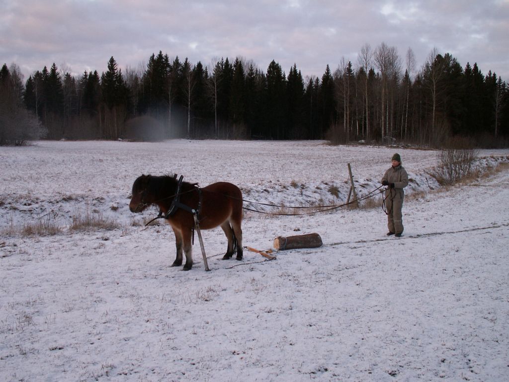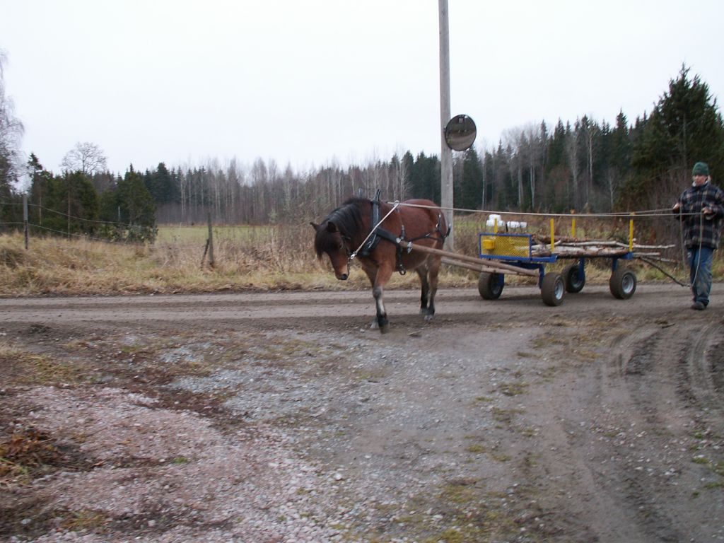 Alldeles precis i början när Arvak började dra fick han dra hem mindre stockar, idag drar han hem riktigt stora stockar.